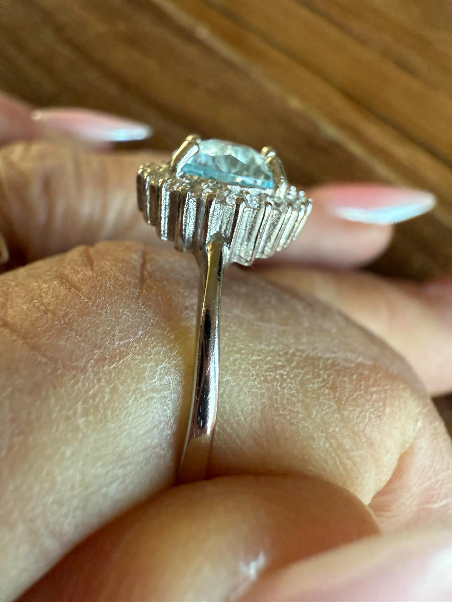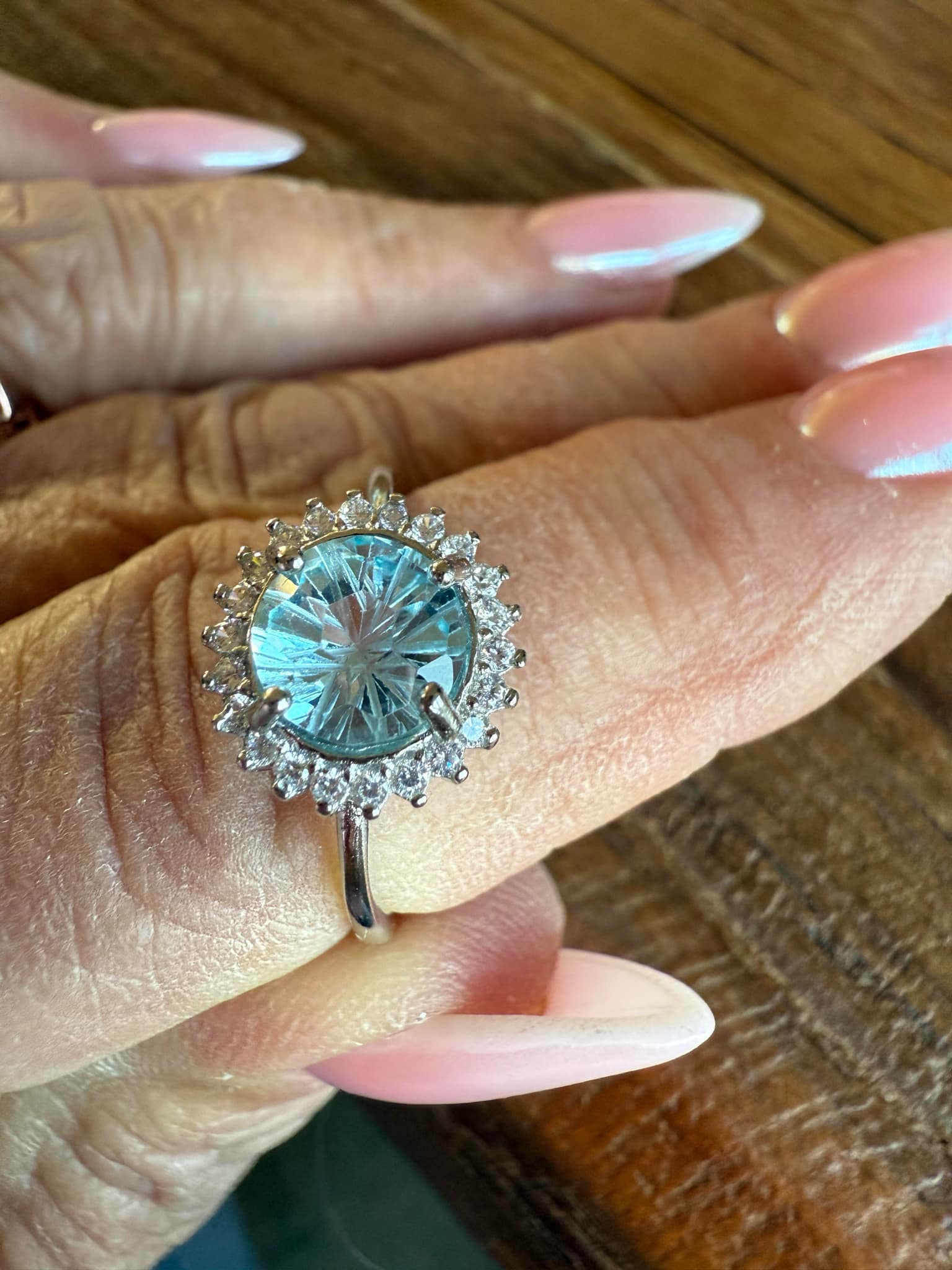 Maat:18 maar is nog verstelbaar Afm: 1.1 cm 925 sterling zilver Aquamarijn Aquamarijn is een blauwe of blauwgroene variëteit van Beril. De naam is ontleend aan de Latijnse term voor ‘water van de zee’, volgens oude overleveringen was Aquamarijn de schat van zeemeerminnen. Zeelieden gebruikten het als talisman om hen te beschermen. Het werd ook gewaardeerd als steen van eeuwige jeugd en geluk. Aquamarijn straalt een bijzonder zachte en liefdevolle en toch heldere energie uit, sterk verbonden met de blauwe galactische straal en verbonden met de dolfijn- en walvisenergieën. Aquamarijn brengt beweging, speelsheid en wijsheid, maar ook kalmte en verkoeling in allerlei omstandigheden, van opvliegers tot woede. Als steen van het element water brengt het je in contact met je onderbewuste, de spirituele wereld en je diepste emoties. Aquamarijn geeft vrouwen de moed en de helderheid om hun innerlijk weten te uiten en verbetert hun intuïtieve vermogens. Deze fantastische steen is een pad naar communicatie met de Godin in jezelf. Bij mannen verdrijft het emotionele verdoofdheid waardoor ze gemakkelijker hun gevoelens uiten. Ook heel goed voor verlegen kinderen en kinderen die een traumatische situatie hebben meegemaakt. Blauwe Aquamarijn is één van de krachtigste stenen om je keelchakra schoon te maken en te activeren, hij zorgt ook voor verbinding met je oren en innerlijk horen en zorgt dat je gevoeliger wordt voor subtiele energieën. De steen kalmeert en vermindert stress en bestrijdt de neiging te oordelen, hij brengt je in een ontspannen, alerte staat van bewustzijn, waarbij je je volledig gewaar bent van je eigen weten, wijsheid en gevoelens en deze helder en met overtuiging kunt verwoorden. Het heft blokkades in de communicatie op en bevordert zelfexpressie en je hoogste waarheid te communiceren en helpt onderliggende emotionele kwesties te begrijpen, verlicht angsten en vergroot de gevoeligheid. Aquamarijn helpt je te werken aan verdriet, want het helpt je gehechtheid aan het lichaam van iemand die je na staat los te laten, maar een positieve verbinding met het spirituele wezen van de ander te behouden. Aquamarijn beschermt de aura en brengt de chakra’s op één lijn. Dankzij de diepe reinigende energie kun je overgangen en veranderingen snel doorlopen, weerstand opzijzetten en je angst voor het onbekende overwinnen. Perfect voor wanneer alle bagage je te zwaar is geworden, hij helpt je bij het loslaten en opruimen. Werkt ondersteunend bij  keelpijn, gezwollen klieren, schildklierproblemen en versterkt de reinigende organen. Ondersteunt de ogen, gebit en de maag en goed bij hooikoorts en allergie. Andere vormen van Beril zijn Morganiet (roze Beril), Heliodoor (gouden Beril), Gosheniet (witte Beril), Smaragd (groene Beril) en Bixbiet (rode Beril) deze hebben wij allen in ons assortiment.