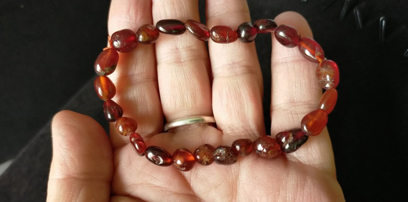 ongeveer 18 cm op  elastiek geregen 8 mm pebble kralenDeze granaat stimuleert alle aspecten van je creatieve vermogens en energieën. Hessoniet moedigt je aan om actie te ondernemen die is afgestemd op je dromen, innerlijke beelden en doelstellingen.Oranje Hessoniet is één van de krachtigste stenen voor voorspoed, samen met Citrien. Op fysiek niveau heelt de steen beperkingen, of het nu die van gezondheid treft of bij geldproblemen. Deze granaat stimuleert alle aspecten van je creatieve vermogens en energieën. Hij moedigt je aan om actie te ondernemen die is afgestemd op je dromen, innerlijke beelden en doelstellingen. Hessoniet reinigt het eerste t/m het derde chakra en geeft die een nieuwe impuls. Hessoniet is vooral heel krachtig voor je 2e chakra. Hij kan de stroom van chi-energie door het lichaam vergroten, geeft kracht, energie, herstelt krachtig en helpt je om gezond te zijn. Ook een goede steen voor passie en seksuele energie. Helpt je te creëren en te manifesteren. Hij reinigt de chakra’s en voorziet ze van nieuwe energie. Wanneer je in een hectische periode verzeild bent geraakt, helpt de granaat je hoe eruit te komen en je leven te veranderen, dit is de steen van verzoening. Hij geeft aandacht en maakt dienstbaar voor de medemens. Granaten hebben een sterke band met de hypofyse en stimuleert een verruimd bewustzijn en het oproepen van herinneringen aan vorige levens. Deze steen activeert andere kristallen, waardoor hun effect wordt versterkt. Dit is een prima steen bij concentratiegebrek of bij ongecontroleerde driftbuien. Hij helpt een intens verdriet of hectische periode te verwerken, hij geeft hoop en moed en versterkt het overlevingsinstinct. Als je deze steen een tijd draagt zal hij je mensenkennis vergroten. Hessoniet lost nutteloze ingesleten gedragspatronen op en gaat voorbij aan weerstand of onbewuste, zelf veroorzaakte sabotage. Emotioneel heft hij remmingen en taboes op, opent het hart en geeft zelfvertrouwen. Hij zorgt ervoor dat je bij jezelf blijft. Hij helpt om hoogtevrees en fobieën te overwinnen.Hessoniet is ook goed als je rugpijn hebt door de menstruatie. Stijfheid en verkramping van de spieren worden minder, mede omdat alle chakra’s met elkaar in verbinding worden gebracht. Verder is hij heel goed voor de blaas en de nieren, maar vooral voor ontspanning op alle organen. Ook is hij heel goed bij vergeetachtigheid. Hij zuivert het bloed, hart en longen en herstelt DNA, daarnaast ondersteunt hij bij de opname van mineralen en vitaminen. Ondersteunt bij artritis en reumatiek en vergroot de vruchtbaarheid.