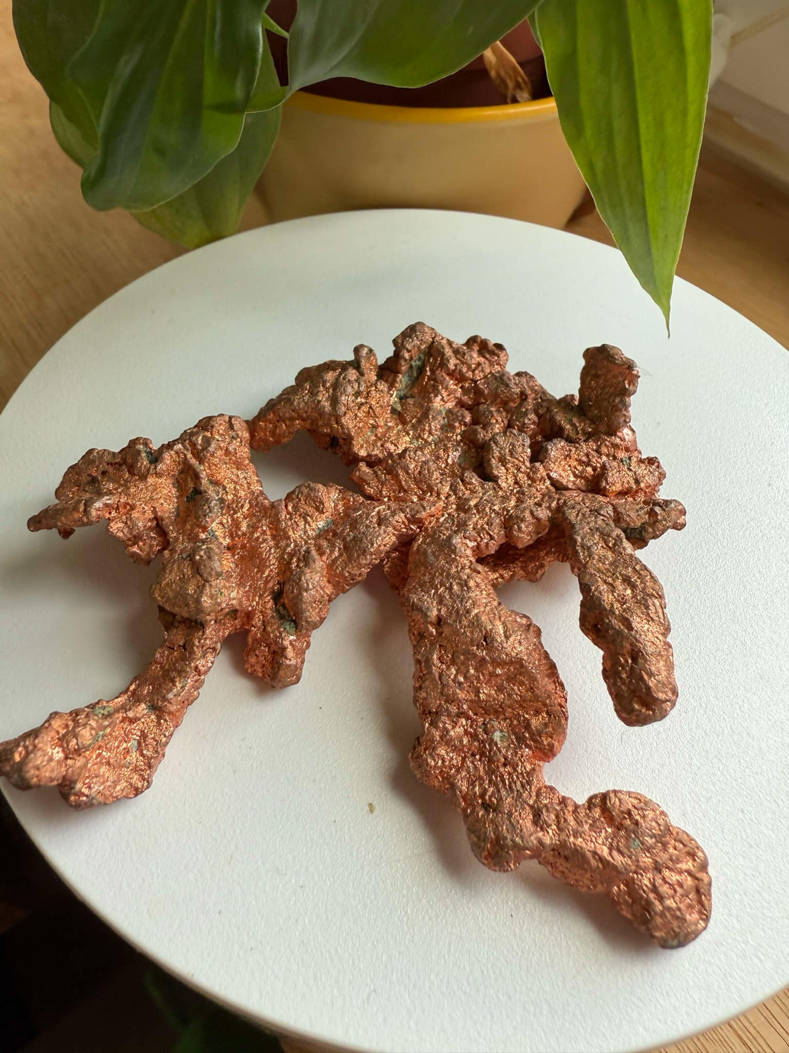 Afm: 8 x 8 x 1.8  cm Gewicht: 118 gram Koper Koper is een metaal met het symbool Cu uit het periodieke systeem dat tot het element water behoort en verbonden is met de planeet Venus. Het werd al rond 8700 voor Christus gebruikt. In de mythologie en alchemie wordt koper vaak geassocieerd met de godin Aphrodite vanwege de mooie glans. Koper helpt liefde, schoonheid en harmonie te ervaren, het geeft moed en versterkt het zelfbewustzijn. Lichamelijk heeft koper een gunstige uitwerking bij krampen van allerlei aard en is ondersteunt voor het genezingsproces. Het geleidt energie en balanceert het lichaam en verwijdert blokkades die voor ziekte en onbalans zorgen. Het is een metaal van Sjamanen en helers. Koper is heel goed voor lichaam, geest en de hersenen. Het zorgt voor harmonie van het fysieke en de astrale lichamen en lijnt deze uit. Koper kan heel goed samen met kristallen gebruikt worden omdat deze de steen uitlijnt met het individuele energieveld van ieder persoon. Door koper samen met stenen te gebruiken creëer je een unieke balans van energie. Koper niet met water reinigen. Koper is goed voor de lever en werkt ondersteunend bij reumatische klachten, het stabiliseert de bloedsroom en helpt wonden schoon te helen omdat het bacteriën bevecht. Heel goed op je basis en hart chakra. Koper helpt bij vermoeidheid, lusteloosheid en rusteloosheid en het accepteren van het zelf.