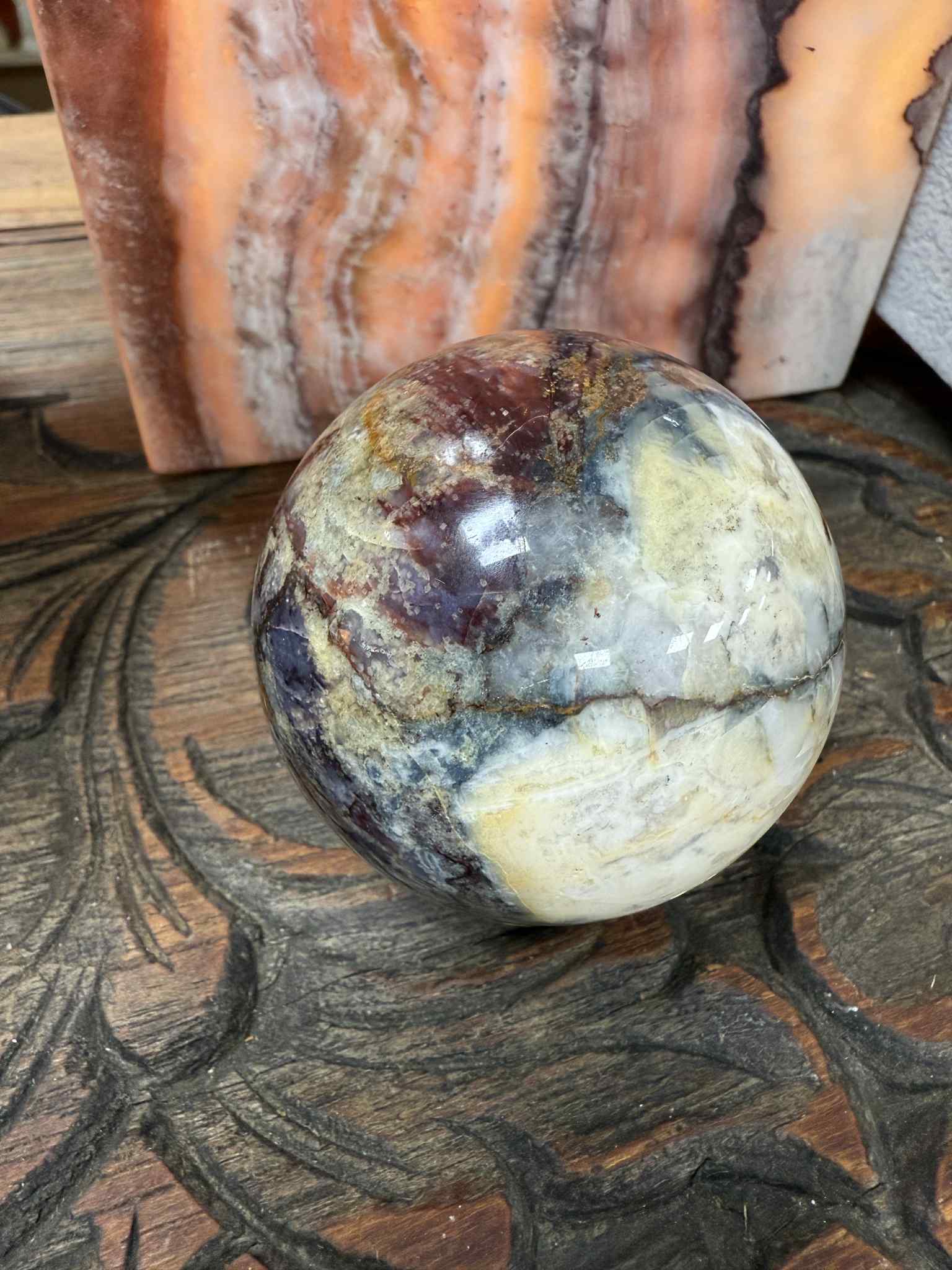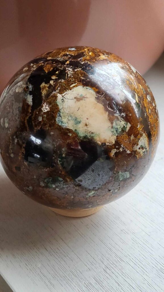 Afm: 6.5 cm doorsnede Gewicht: 386 gram Pietersiet Namibië Pietersiet is nog niet zo heel lang geleden ontdekt. Naar verluidt bevat het ‘de sleutels van het koninkrijk der hemelen’. Pietersiet verbindt je alledaags bewustzijn met het spirituele en herinnert je eraan dat je een spiritueel wezen op een menselijke reis bent.Pietersiet bezit het vermogen je in je etherische lichaam te aarden. Dit maakt spirituele reizen gemakkelijker, vooral die met als doel de Akasha-kronieken te lezen en kennis te nemen van je vorige incarnaties. Pietersiet versterkt je eigenwaarde, twijfelaars geeft hij zelfvertrouwen. Pietersiet geeft je ruggengraat. Bij personen met een burn-out versterkt hij de realiteitszin en brengt ze weer terug bij hun kern. Hij brengt ook evenwicht en versterkt de intuïtie in gevoelszaken. Daarnaast maakt hij personen losser en toegankelijker voor de medemens, zodat liefde eenvoudiger gegeven en ontvangen kan worden. Deze steen geeft ook troost. Pietersiet werkt krachtig met het lichaam tijdens beweeglijke meditaties en heeft snel toegang tot een zeer hoge staat van veranderd bewustzijn. Hij stimuleert het derde oog en de pijnappelklier. Pietersiet heft de illusie van afgescheiden zijn op en overtuigingen en conditoneringen die door anderen zijn opgelegd verwijdert hij. Hij verbindt je weer met de bron van je eigen innerlijke leiding. Hij heft hardnekkige blokkades op en maakt een einde aan verwarring. Ook die uit vorige levens. Hij helpt oude conflicten en onderdrukte gevoelens te verwerken. De steen verhelpt ongemakken bij mensen die uitgeput zijn en geen tijd hebben om te rusten. Hij werkt positief op de maag, darmen, lever en de blaas, hij stimuleert het hele gebied van de zonnevlecht. Hij ontspant nek en schouders en dus hoofdpijn wat hier door ontstaat. Bij huilbaby’s of driftige mensen brengt hij de nodig rust en ontspanning. Huiduitslag en allergieën werken positief op het drinken van een elixer van deze steen. Hij verbeterd de coördinatie bij een wankel evenwicht en duizeligheid. Pietersiet stimuleert de hypofyse en zorgt voor evenwicht in het endocriene stelsel en voor de productie van hormonen die de stofwisseling, de bloeddruk, de groei, seks en temperatuur regelen, dus ook goed bij opvliegers. Hij is ook goed voor de longen, de benen en de voeten.