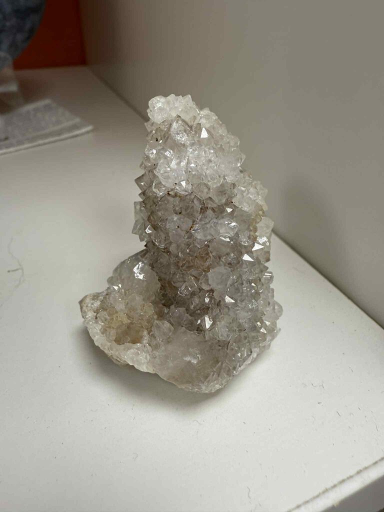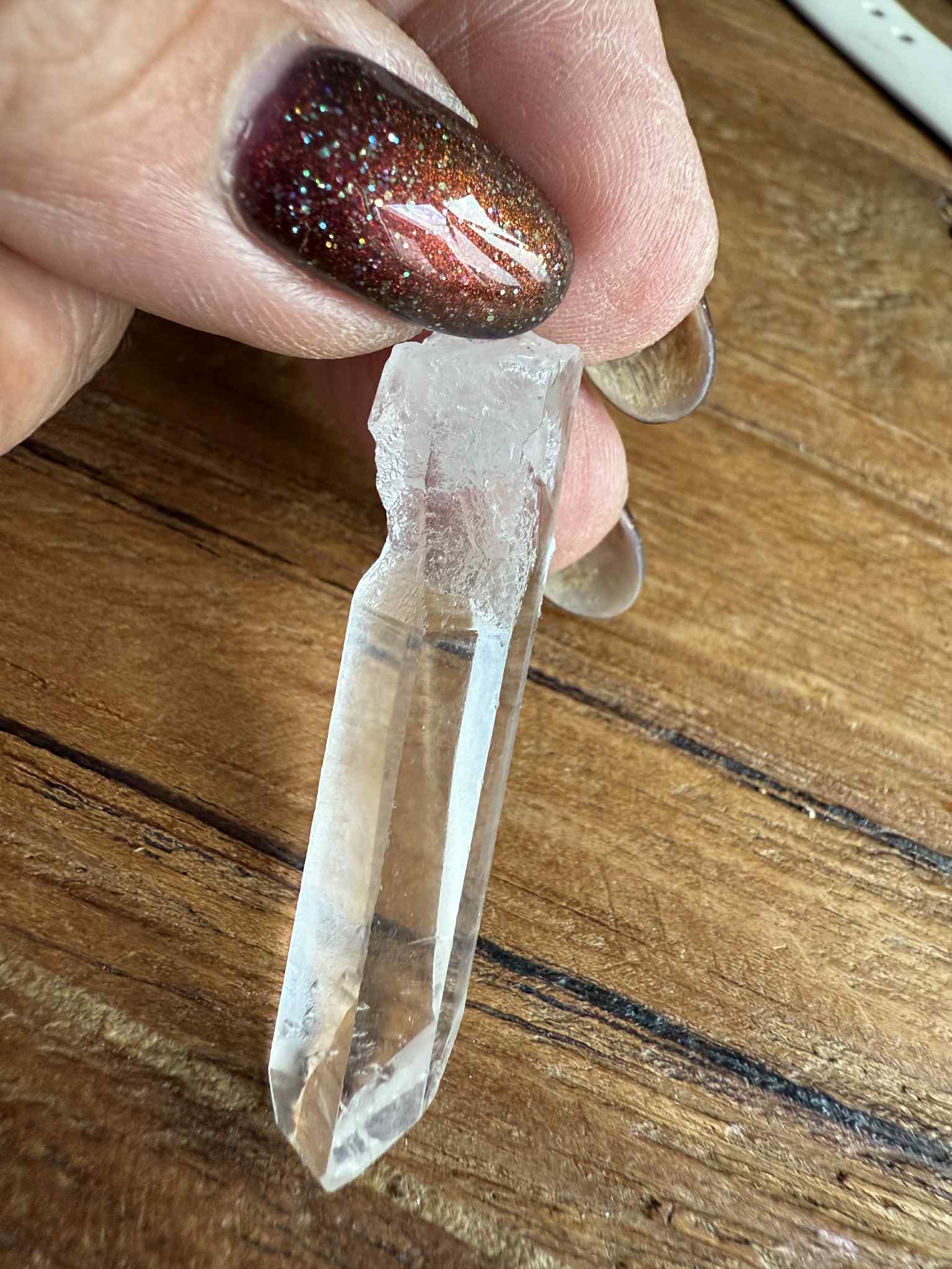 Afm: 5 x 1.2 cm Silver Line Lemurian uit Diamantina(02) Silver Line Lemurians zijn recent gevonden in Diamantina, Brazilië. Deze   punten, lasers, selfhealers en clusters zijn heel helder en veel bevatten zand-achtige inclusies. Al deze kristallen hebben een zeer hoge vibratie en zijn krachtig verbonden met het zilveren koord, onze ‘lijn’ met ons hogere zelf, met wie wij zijn in andere werelden. Ze zijn ook verbonden met de energie van hogere beschavingen die ooit op aarde waren, zoals die van de Lemurianen, met het Gouden tijdperk van Atlantis en met de Hators uit het oude Egypte, die verbonden zijn met de zachte en liefdevolle energieën van Venus. Ze zijn verbonden met het veld waarin we nog afgestemd waren op ons weten, op het grotere geheel, in samenwerking met de aarde en de kosmos. We zijn nu niet meer zo etherisch, we hebben ons licht verinnerlijkt, verstoffelijkt, maar we mogen het nu zonder angst uit gaan stralen. Silver Line Lemurians zijn ook krachtige beschermers, ze werken niet tegen iets, maar beschermen doordat ze je in je lichtkracht zetten. Dit licht zal je bescherming zijn. Deze kristallen zijn ooit geactiveerd met kristallijnen codes, waardoor heling kan plaatsvinden en het nieuwe Gouden Tijdperk voor de mensheid weer kan aanbreken. Deze kristallen zijn niet voor niets in deze unieke tijd gevonden, energetisch helpen ze ons door processen van deze tijd te gaan. Ze laten ons het volgende voelen; er is zoveel beweging geweest de laatste tijd, we zijn door pittige zandstormen gegaan. Het leek en voelt soms nog alsof er zand in de ogen gestrooid is, waardoor je niet meer helder kon zien, niet meer kon vertrouwen op wat je zag. Het zand in deze unieke kristallen symboliseert dit, het zand is gevangen in de kristallen. De steen zegt; Alles gaat op zijn plek vallen, gevoelens van onmacht zullen gaan verdwijnen, er zal rust komen. Er gaan omwentelingen komen en je zult anders gaan zien. Het uiterlijke plaatje vervaagt, alsof dit een Fata Morgana was, niet de werkelijkheid was. Jullie zullen bij een andere werkelijkheid komen, deze is verbonden met hier op aarde zijn, maar in een andere laag. Er zullen veel ‘aha’ momenten komen. Je zult bij je weten komen, op een stevige, solide manier. Dus niet meer vol twijfels zijn, maar gaan vertrouwen op je weten, op je gevoel, op je kanaal, op je afstemming naar je hogere deel. Je zult hier met gemak voor gaan staan, deze afstemming gaan leven. In je afstemming liggen alle antwoorden, zal de tunnel view, het beperkte denken, het benauwde gevoel waarin je gevangen zit gaan verdwijnen. Ieder kristal is uniek, je zult getrokken worden tot het kristal wat bij je past, of de cluster die in je huis bij je familie past, of die in je praktijk of groepsruimte past. We bevinden ons nu in de overgang naar het kristallijne tijdperk, ons proces samen met Moeder Aarde naar Ascensie en deze en meer kristallen die nu gevonden worden helpen ons daarbij.